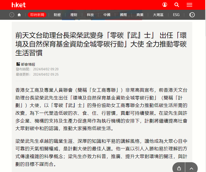 經濟日報 (2024/04/02) 前天文台助理台長梁榮武變身「零碳『武』士」 媒體報導2 4 月, 20243KViews1Like0Comments香港經濟日報 (2024/04/02)Read More
