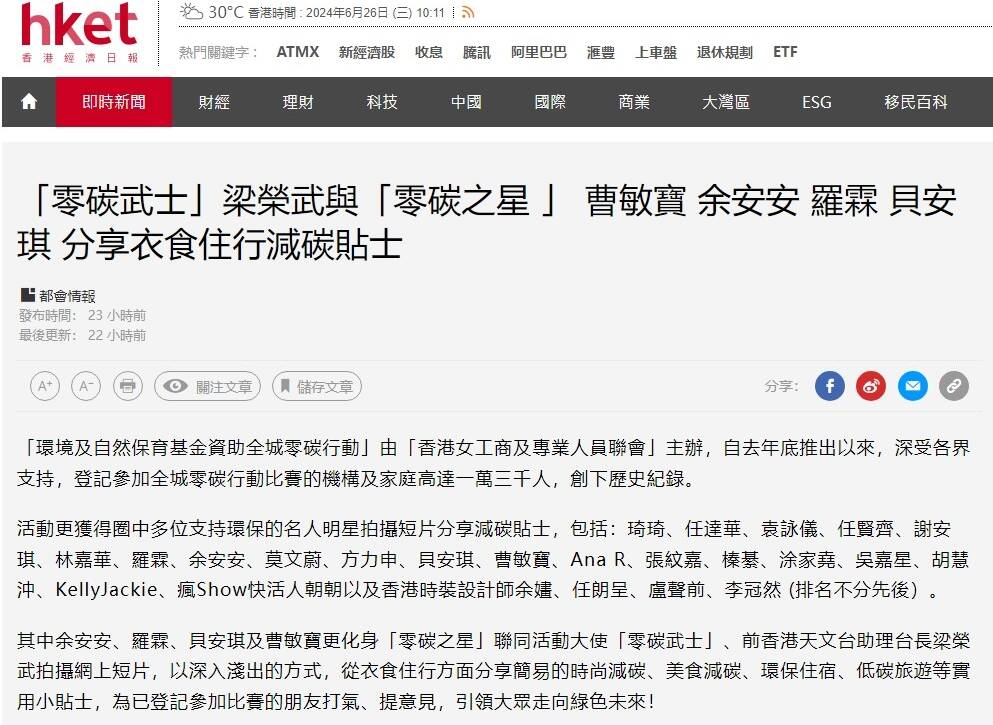 香港經濟日報 (2024/06/25)「零碳武士」梁榮武與「零碳之星 」 曹敏寶 余安安 羅霖 貝安琪 分享衣食住行減碳貼士 媒體報導26 6 月, 20244KViews1Like0Comments香港經濟日報 (2024/06/25)Read More