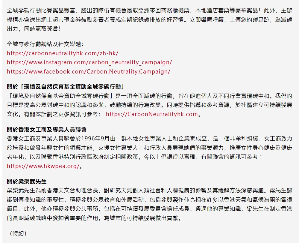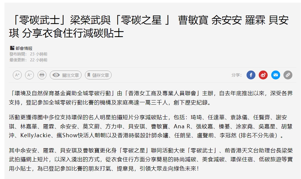 香港經濟日報(2023/11/23)極端天氣影響嚴重 減碳生活刻不容緩 環境及自然保育基金資助女工商專聯推出全城零碳行動