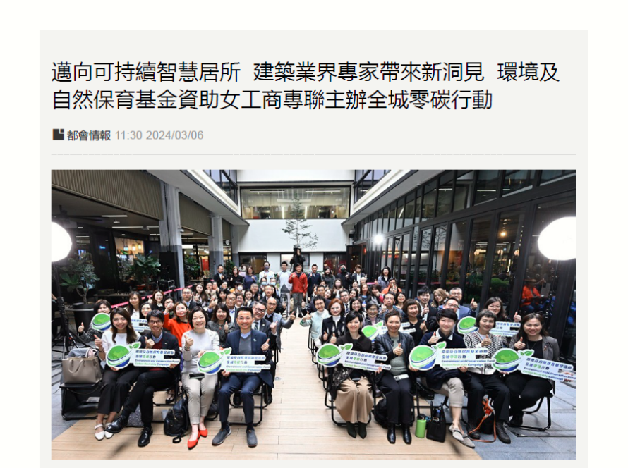 經濟日報 (2024/03/06) 邁向可持續智慧居所 建築業界專家帶來新洞見 環境及自然保育基金資助女工商專聯主辦全城零碳行動
